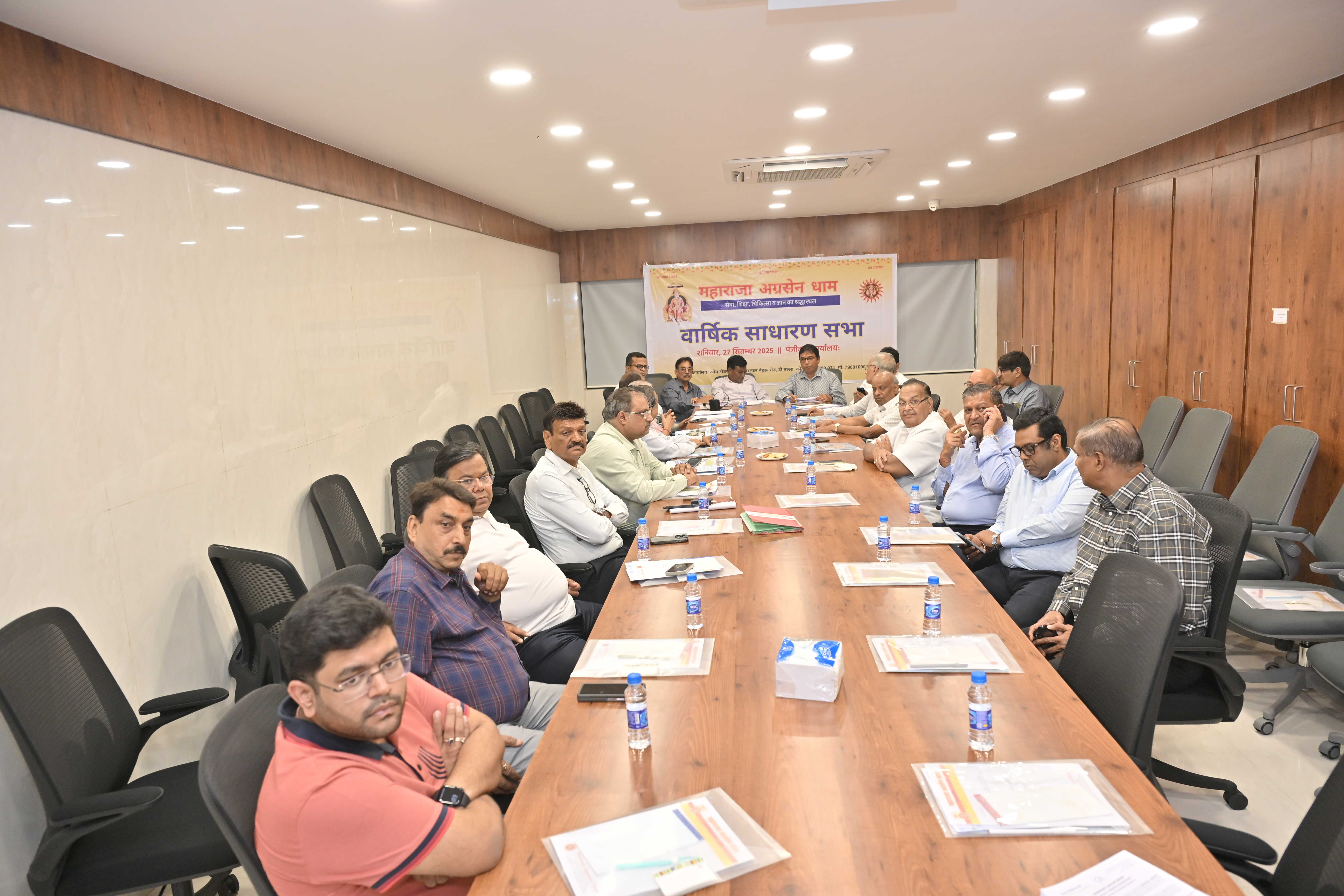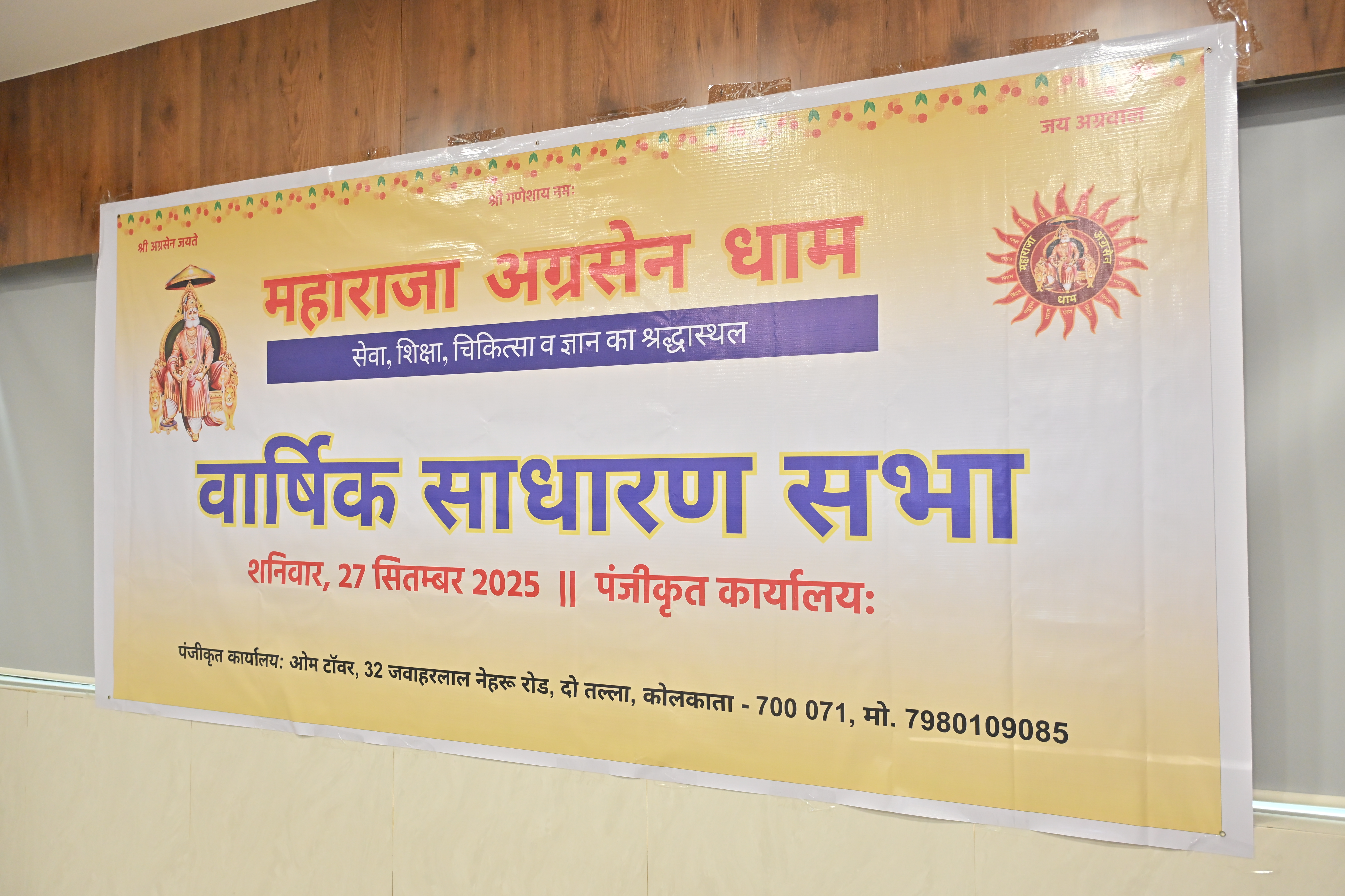 The Annual General Meeting (AGM) of the Trustees of Maharaja Agrasen Dham was successfully held on Saturday, 27th September 2025, at the Dham’s registered office (Om Tower, 32 Chowringhee Road) under the chairmanship of Shri Om Jalan, President of the Dham.During the meeting, the accounts and audited report for the year 2024–25 were presented before all trustees by Shri Anil Kedia, Co-Treasurer of the Dham. The report was unanimously approved by all trustees present.Shri Nirmal Saraf, Secretary of the Dham, briefed all trustees about the activities carried out during the year 2024–25 and also shared details of the ongoing and upcoming plans and initiatives for the current year 2025–26.On this occasion, two new initiatives of the Dham — “UPSC Academy” and “Gathbandhan – Agrasen Samaj Matrimony” — were formally inaugurated. Following this, the first look of the Directory cover page was unveiled before the trustees.The meeting concluded with a vote of thanks delivered by Shri Ashok Churiwala, Joint Secretary of the Dham. Around more than 50 trustees were present at the meeting.